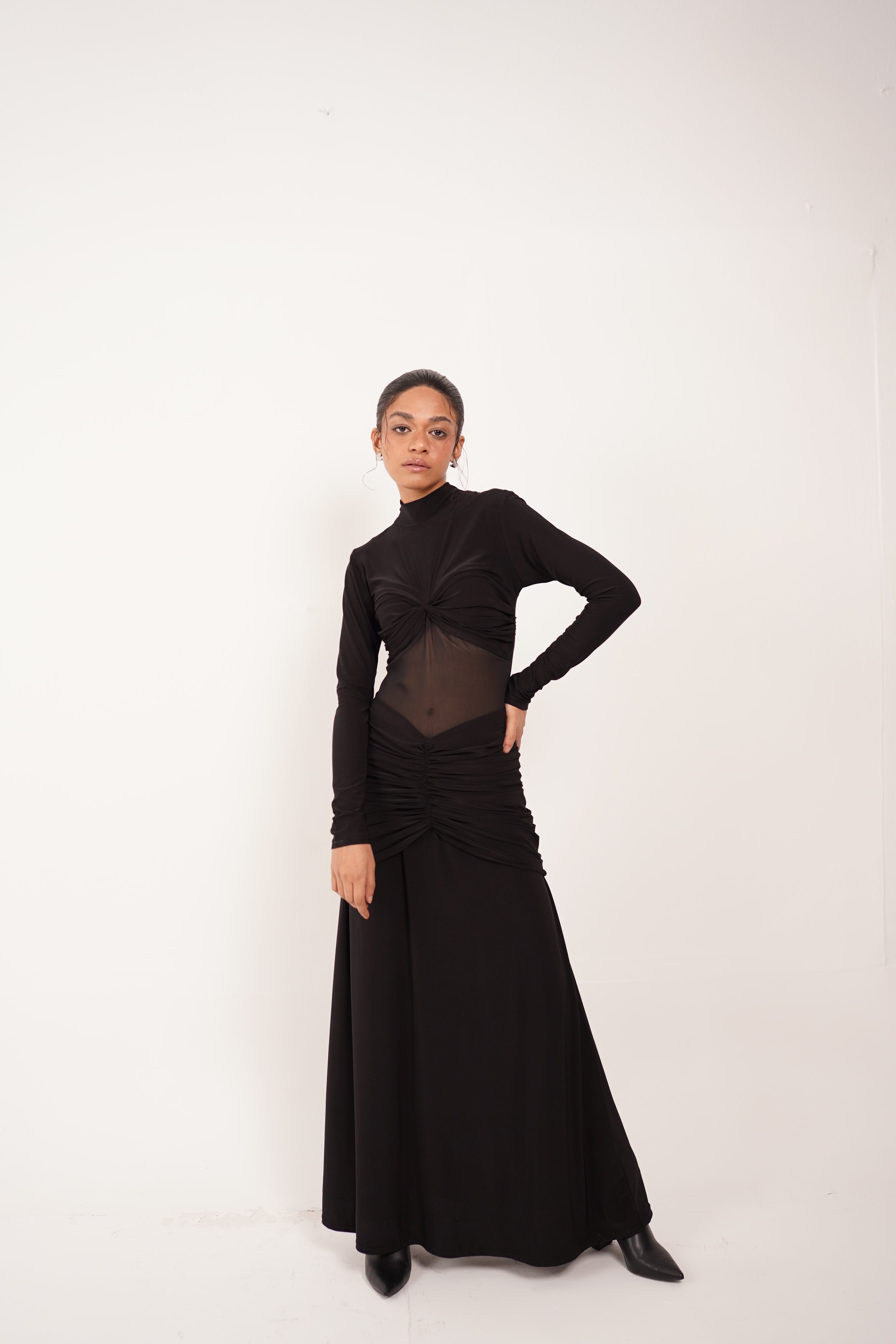 A black scrunched mermaid dress, adorned with ethreal mesh details, crafted from the finest jersey.